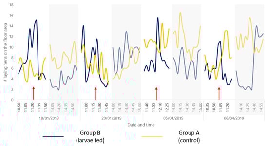 Live larvae-fed hens (Group B) counts on the floor were higher during the morning than the afternoon. Group A hens (control) counts on the floor were lower in the morning compared to Group B hens. However, Group A hens counts on the floor were higher in the afternoon compared to Group B hens. It might be suggested that the supply of larvae in the morning fulfilled the need of laying hens to show feed searching behavior (i.e., their behavior was rewarded). Results from the current research indicate that provision of live black soldier fly larvae could facilitate hens in expressing their natural behavior. Expression of natural behavior is also linked to reduced feather pecking in case of laying hens [40] and will contribute to bird welfare.