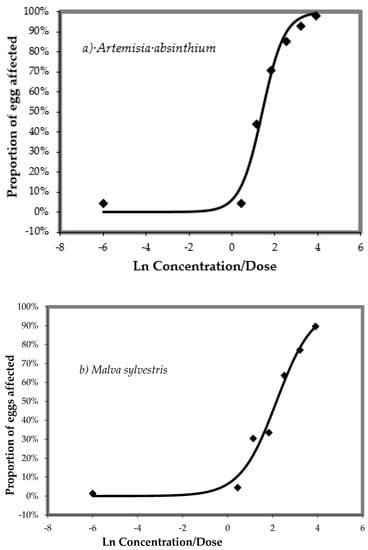 (a,b) Dose-response relationship of plant aqueous extracts against Haemonchus contortus in the egg hatch test (EHT) after 24 h of incubation at 26 °C.