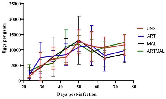 Statistical analysis was performed using analysis variance (GraphPad Prism 8, GraphPad Software, Inc., San Diego, CA, USA) as repeated-measures mixed models representing the four animal groups (UNS, ART, MAL, ARTMAL) and sampling days. Differences between the animal groups were analysed by a two-way ANOVA with a Bonferroni post hoc test. Differences between the arithmetic EPG means between groups and between worm counts at dissection were analysed by Student’s t-tests. A logistic regression model was used to determine the ED50 and ED99 [24].