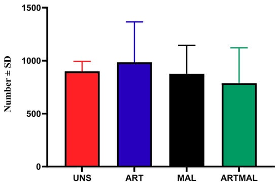 The patterns of egg shedding for UNS, ART, MAL and ARTMAL are shown in Figure 2. Data from D36 were statistically compared and used to determine the reduction in egg output for ART, MAL and ARTMAL relative to UNS. Mean faecal eggs per gram (EPGs) were influenced by time from infection (p < 0.05), and for all groups, EPGs increased until D50 or D57, respectively. The EPGs in the lambs treated with MAL, ART and ARTMAL compared with UNS group did not differ (p > 0.05). The necropsy on D75 found a numerical decrease (p > 0.05) in the abomasal worm counts for the ARTMAL groups compared to the other groups (Figure 3).