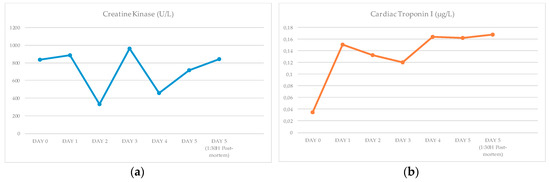 It was possible to observe that every single result obtained for CK was high. It is important to remark the new peak of the value on day 3. This animal presented one value within the normal range on day 0 for cTnI, being the rest of the measurements elevated. As noticed in the CK, the cTnI also presented a peak on day 4 and 5–1:30 h after euthanasia. The animal demonstrated higher BUN values and lower creatinine level than normal values.