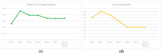 Biochemical analysis during rehabilitation and after euthanasia: (a) Creatine kinase (CK); (b) Cardiac troponin I (cTnI); (c) Blood urea nitrogen (BUN); (d) Creatinine.