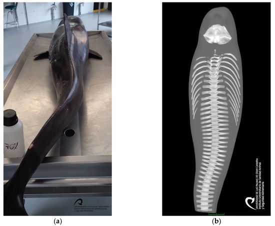 This study is of a juvenile male Risso’s dolphin (Grampus griseus) which was stranded alive on the coast of Gran Canaria (Canary Islands, Spain), on April 26, 2019 (notification at 8:30 a.m.). After receiving specialized first aid (i.e., help maintaining correct body posture and wetness of skin, evaluating breathing and heart rate) at the location, the animal was transferred to the Wildlife Recovery Center (Gran Canaria), where it was monitored 24 h a day. From day 0 (26 April 2019) to day 5 (1 May 12019), several diagnostic tests (i.e., biochemical and hematological analysis, gastric probing and ultrasound evaluation) were performed to establish the most appropriate treatment. Around 10 p.m. on 29 April 2019 (day 3), the animal began to have muscle spasms. The next day, a lateral body curvature began to develop at the caudal peduncle, with increasing muscle tremors. Due to the worsening prognosis the animal was euthanized on 1 May 2019 (day 5). The therapeutic treatment and the euthanasia protocol applied in this animal are described in the Supplementary Materials Tables S1 and S2, respectively.
