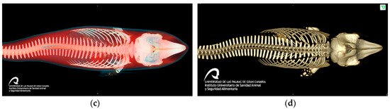 Animal caudal peduncle scoliosis: (a) Caudal view on the necropsy table; (b) Dorsal plane of the entire body, with computer tomography (CT); (c) Dorsal view of the entire body, using CT, bones in white, muscle in red, and skin in blue; and (d) Dorsal view of the skeleton, with the CT.