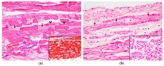 Histochemical techniques: (a) Contraction band necrosis (arrow heads), segmentary fibrilar degeneration (thick arrows) with hyalinized eosinophilic sarcoplasm and hypercontraction (thin arrows); 20x, HE. Inset: Detail of the myocytes with contraction band necrosis (arrow heads) and segmentary fibrilar degeneration (thick arrows) with hyalinized eosinophilic sarcoplasm and hypercontraction (thin arrows); 20×, Masson’s trichrome technique; (b) Contraction band necrosis (arrows) in the cardiomyocytes; 40×. Inset: Detail of the intracytoplasmic vacuoles (arrows) of the cardiomyocytes; 60×, HE.