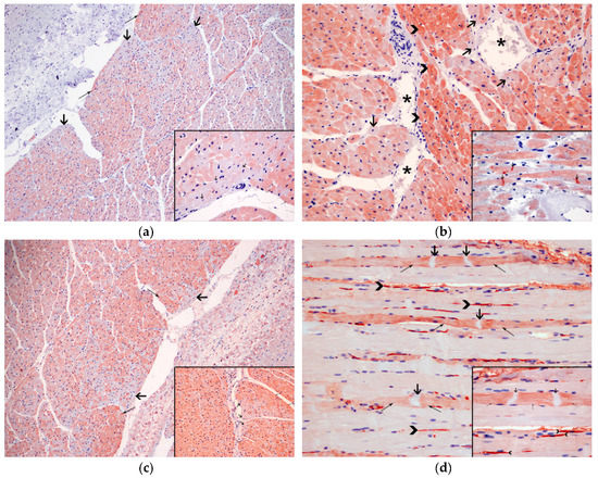 Histological findings are consistent with ischemia-reperfusion injury, such as vascular changes (i.e., congestion, hemorrhages, interstitial edema) and acute necrotic degenerative lesions (i.e., contraction band necrosis, wavy fibers, hypereosinophilia and cytoplasmic vacuolization) [4,5,8].