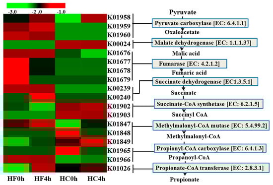 Genes encoding enzymes that are directly involved in propionate were analyzed for their abundance in HC and HF treatments. Genes encoding the lactate-acrylate pathway produce propionate (Figure S1 and Table S3). Diet had a significant effect on the genes with only the exception of gene K00016 for acyl-CoA dehydratase (EC:1.3.8.7). The K00249 for lactate dehydrogenase (EC:1.1.1.27) was higher in the HF treatment than that in the HC treatment, whereas, K01026 for lactyl transferase (EC:2.8.3.1) was just the reverse. However, in the lactate-acrylate pathway, the representative genes of lactoyl-CoA dehydratase (EC: 4.2.1.54) are not included in the KEGG gene dataset; therefore, this metabolic pathway cannot produce propionate.