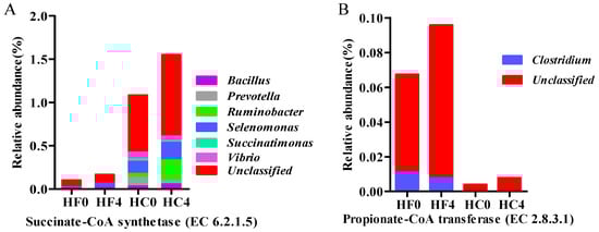 Bacillus, Prevotella, Ruminobacter, Selenomonas, and Vibrio were the main microorganisms encoding Succinate-CoA synthetase (Figure 2A), indicating that such microorganisms played a major role in the propionate formation, and the relative content in HC group was significantly higher than that in HF group. Propionyl-CoA transferase encoding by Clostridium and unclassified bacteria in HF group, but only unclassified bacteria in HC group (Figure 2B), indicating that Clostridium plays a major role in the propionate formation.
