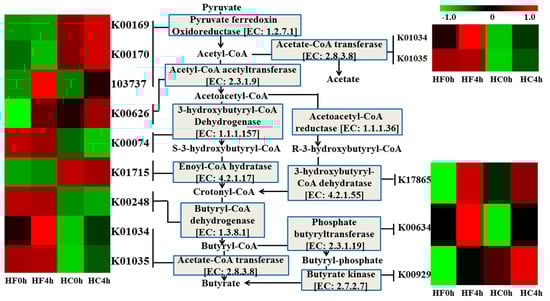 Many genes involved in butyrate metabolism were differentially abundant in the metagenome datasets among the four groups (Figure 3 and Table 3). With the exception of gene K00074 for 3-hydroxybutyryl-CoA dehydrogenase (EC:1.1.1.157) and genes K01715 for enoyl-CoA hydratase (EC:4.2.1.17), all genes encoding the translation of pyruvate into butyrate showed different in the two treatments or before and after feeding. The genes K00169 and K00190 for pyruvate ferredoxin oxidoreductase (EC: 1.2.7.1) was affected by an interaction between feed and time. The effect of time was observed in acetyl-CoA acetyltransferase (EC:2.3.1.9) between the before and after feeding, and acetyl-CoA acetyltransferase was higher after feeding than before feeding. Gene K00248 for butyryl-CoA dehydrogenase (EC:1.3.8.1) and genes K01034 and K01035 for acetate-CoA transferase (EC:2.8.3.8) were affected by feed and showed higher in HF treatment compared to those in HC treatment. The enzymes of butyryl-CoA dehydrogenase (EC:1.3.8.1) and acetate-CoA transferase (EC:2.8.3.8) were needed for the last two steps in the formation of butyrate, Therefore, the butyrate in the HF treatment should be higher than that in the HC treatment, which was consistent with the content of butyrate. Gene K00929 for butyrate kinase (EC:2.7.2.7) and gene K00634 for phosphate butyryltransferase (EC:2.3.1.19) were affected by both feed and time. From Figure 3, we can see that butyrate kinase (EC:2.7.2.7) is the final enzyme to produce butyrate from another branch pathway, and HC4h was highest, which was consistent with the content of butyrate, indicating butyrate via butyrate kinase pathway formation. However, the genes for acetoacetyl-CoA reductase (EC:1.1.1.36) and correlations to butyrate yield were not available in the KEGG database. Therefore, butyryl-CoA directly produces butyrate via acetate-CoA transferase (EC: 2.8.3.8), rather than another branch pathway. This result may be due to the high content of rumen microbes that produce butyrate or use of acetate as a precursor for butyrate synthesis under conditions of lactate fermentation (where lactate fermentation could occur).