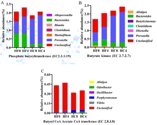 Microbial composition of key enzymes encoding the butyrate production pathway (Genus). (A): Phosphate butyryltransferase (EC2.3.1.19); (B): Butyrate kinase(EC2.7.2.7); (C): Butyryl CoA Acetate CoA transferase (EC2.8.3.8).