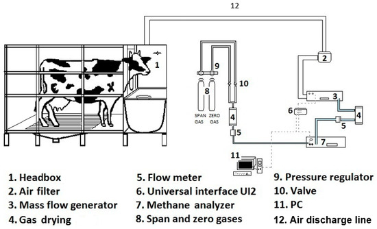 Recently, there has been growing global concern regarding the interlinkage of climate change and air quality, thus inspiring many investigations into evaluating the effects of greenhouse gases (GHGs) on the environment. Cattle are responsible for approximately 53% of GHG emissions from agricultural sources, with approximately 87.4 million tons of CO2 eq. being emitted worldwide in 2012 [1,2]. A significant portion of environmental GHG emissions derives from the process of rumen fermentation that constitutes a highly specialized type of energy metabolism by strictly anaerobic Archean methanogenic prokaryotes [3] found in the digestive tract of ruminants. It has been estimated that approximately 37% of the world’s CH4 emissions are produced by the livestock sector [4]. In recent years, interest in accurately measuring these emissions and developing emission inventories to support GHG-mitigation strategies has increased. On the other hand, the complexity and variation among livestock production systems and the high cost of the analytical equipment make quantifying GHG emissions difficult in developing and underdeveloped countries.