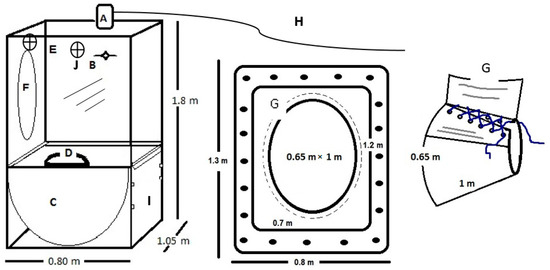 1. The head-box was designed based on the average head and neck sizes of large breeds of dairy cattle, e.g., Holstein and Brown Swiss cows (Figure 2). The dimensions (width × length × height) of the head-box were 1.05 m × 0.8 m × 1.80 m. The frame of the head-box was made of stainless steel (3.5 cm × 3.5 cm), and the walls, ceiling, and floor were constructed of sheets of transparent acrylic (0.6 cm thick). Acrylic was used to ensure the complete visibility of the animal. The front of the head-box included a removable acrylic door with dimensions of 1.0 m × 0.75 m × 0.50 m, which was sealed by sliding latches on the side of the box and allowing access to the feeder. On the back of the head-box, an oval opening (0.65 m × 1 m) allows the cow’s head to enter the box. A hood was added to the box’s opening (Figure 2G).