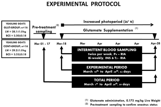 The reactivation of ovarian function was confirmed in both experimental groups based on the P4 serum profiles. For each goat, a serum P4 level ≥ 1 ng mL−1 in two consecutives samples was indicative of ovulation (luteal activity) during the anestrus season (March—April). Therefore, the effect to offer or not supplemental glutamate upon reactivation of ovarian function, as well as serum INS and T3 concentrations, was evaluated. A schematic representation of the main activities performed during the experimental period are depicted in Figure 1.