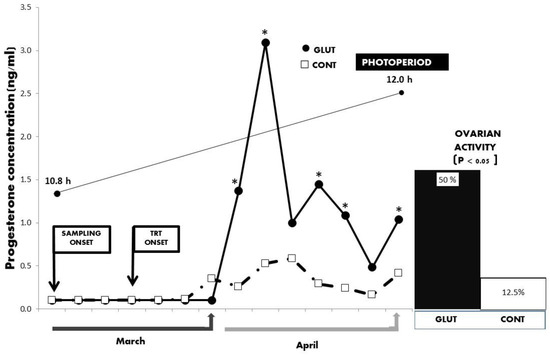 Serum concentrations of progesterone (ng/mL) between treatments across time in Criollo x Saanen-Alpine yearling goats (n = 16; 8/group) supplemented with glutamate (GLUT) or control (CONT) under natural photoperiodic conditions during the anestrous season (March to April) in northern Mexico (26°LN). Note: Whereas the onset of both blood sampling and treatments are indicated, a line denoting the prevailing photoperiod during the experimental period is also included. Superscripts indicate differences (p < 0.05) between treatments within time.