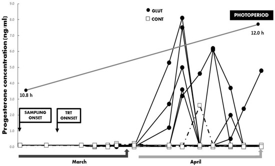 Serum concentrations of progesterone (ng/mL) were collected across time in Criollo x Saanen-Alpine yearling goats (n = 16, 8/group). Experimental groups consider glutamate (GLUT) and control (CONT) under natural photoperiodic conditions during the anestrous season (March to April) in northern Mexico (26°LN). Note: Whereas the onset of both blood sampling and treatments are indicated, a line denoting the prevailing photoperiod during the experimental period is also included.