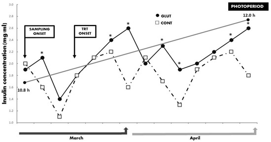 Serum concentrations of insulin (mg/mL) between treatments across time in Criollo x Saanen-Alpine yearling goats (n = 16; 8/group). Experimental groups consider glutamate (GLUT) and control (CONT) under natural photoperiodic conditions during the anestrous season (March to April) in northern Mexico (26°LN). Note: Whereas the onset of both blood sampling and treatments are indicated, a line denoting the prevailing photoperiod during the experimental period is also included. Superscripts indicate differences (p < 0.05) between treatments within time.