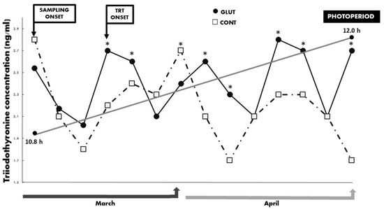 Serum concentrations of triiodothyronine (ng/mL) between treatments across time in Criollo x Saanen-Alpine yearling goats (n = 16; 8/group). Experimental groups consider glutamate (GLUT) and control (CONT) under natural photoperiodic conditions during the anestrous season (March to April) in northern Mexico (26°LN). Note: Whereas the onset of both blood sampling and treatments are indicated, a line denoting the prevailing photoperiod during the experimental period is also included. Superscripts indicate differences (p < 0.05) between treatments within time.