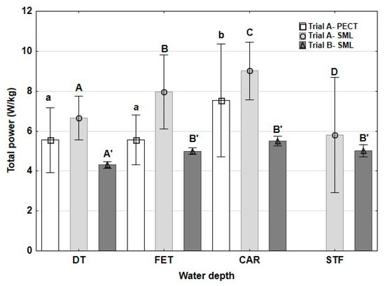 Means and standard deviations (whiskers) of total power measured in horses exercised on a water treadmill at different water depths and velocities. DT: dry treadmill, without water; FET: water at the level of the fetlock; CAR: water at the level of the CAR; STF: water at the level of the stifle. Trial A-PECT: accelerometer fixed in the pectoral region with velocities of 6 km/h; Trial A-SML: accelerometer fixed in the sacrum midline at velocities of 6 km/h with the water at DT, FET and CAR and at a velocity of 5 km/h with the water at STF; Trial B-SML: accelerometer fixed in the sacrum midline at a velocity of 5 km/h in the four water depths. Lowercase letters: significant differences between water depths in trial A-PECT; capital letters: significant differences between water depths in trial A-SML; capital letters with apostrophes: significant differences between water depths in trial B-SML. Different letters indicate significant differences between water depths at each trial p < 0.05.