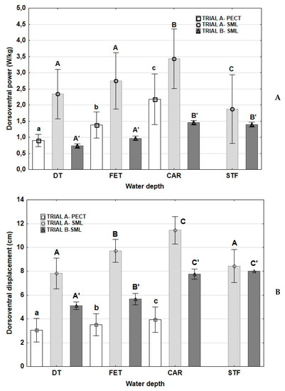 Values of DVP and DVD are depicted in Figure 2. In trial A-PECT, a progressive increase from DT-FET-CAR was found for both DVP and DVD. In trial A-SML, DVD increased from DT with the water depths of FET and CAR, decreasing at a water depth of STF. In the same trial, DVP increased from DT and FET with the water depth at CAR, decreasing at STF depth. In trial B-SML, DVD was significantly lower at DT compared to other water depths, without significant differences between CAR and STF. Also, in trial B-SML, DVP was statistically similar at DT and FET, increasing at CAR and STF, without significant differences between these last depths (Figure 2).