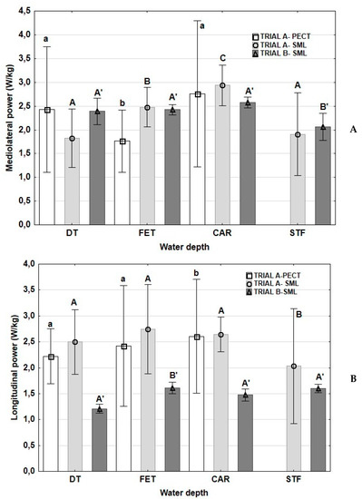 Means and standard deviations (whiskers) of longitudinal (A) and mediolateral (B) power in horses exercised on a water treadmill at different water depths and velocities. DT: dry treadmill, without water; FET: water at the level of the fetlock; CAR: water at the level of the CAR; STF: water at the level of the stifle. Trial A-PECT: accelerometer fixed in the pectoral region with velocities of 6 km/h; Trial A-SML: accelerometer fixed in the sacrum midline at velocities of 6 km/h with the water at DT, FET and CAR and at a velocity of 5 km/h with the water at STF; Trial B-SML: accelerometer fixed in the sacrum midline at a velocity of 5 km/h in the four water depths. Lowercase letters: significant differences between water depths in trial A-PECT; capital letters: significant differences between water depths in trial A-SML; capital letters with apostrophes: significant differences between water depths in trial B-SML. Different letters indicate significant differences between water depths at each trial p < 0.05.