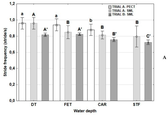 Values of SF and SL are presented in Figure 4. As expected, SF decreased and, consequently, SL increased with water depth in the three trials. When the velocity was reduced in trial A-SML, SL decreased, achieving values significantly similar to those found at DT. However, when the velocity was the same at all water depths, in trial B-SML, SL increased at CAR and further at STF water depth (Figure 4).