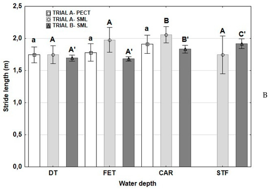 Means and standard deviations (whiskers) of stride frequency (A) and length (B) in horses exercised on a water treadmill at different water depths and velocities. DT: dry treadmill, without water; FET: water at the level of the fetlock; CAR: water at the level of the CAR; STF: water at the level of the stifle. Trial A-PECT: accelerometer fixed in the pectoral region with velocities of 6 km/h; Trial A-SML: accelerometer fixed in the sacrum midline at velocities of 6 km/h with the water at DT, FET and CAR and at a velocity of 5 km/h with the water at STF; Trial B-SML: accelerometer fixed in the sacrum midline at a velocity of 5 km/h in the four water depths. Lowercase letters: significant differences between water depths in trial A-PECT; capital letters: significant differences between water depths in trial A-SML; capital letters with apostrophes: significant differences between water depths in trial B-SML. Different letters indicate significant differences between water depths at each trial p < 0.05.