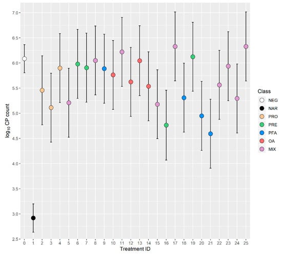 Cecal Clostridium perfringens (CP) counts with 95% confidence intervals. Negative control (NEG) is treatment 0, narasin (NAR) is treatment 1, probiotics (PRO) are treatments 2–4, prebiotics (PRE) are treatments 6, 7, 16 and 19, phytogenics (PFA) are treatments 9, 18, 20 and 21, organic acids (OA) are treatments 10, 12, 13 and 14, and mixed products (MIX) are treatments 5, 8, 11, 15, 17 and 22–25.