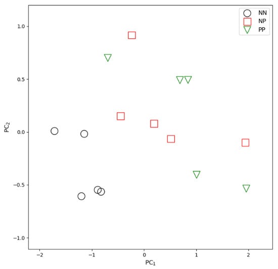 Principal Component Analysis (first 2 components) applied to the three groups of animals analyzed by RNAseq analysis (5 animals serologically positive to the ELISA test for MAP (PP), 5 ELISA-negative potentially exposed animals (NP) and 5 serologically negative unexposed control animals (NN), based on the RNA-seq profile of the 10 signature transcripts.