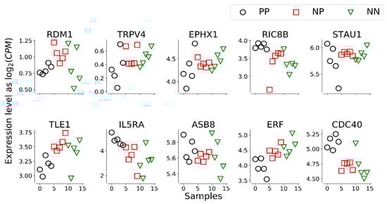 Within the 10 transcripts of the signature, 5 genes (TRPV4, RIC8B, IL5RA, ERF and CDC40) showed significant differential expression between the NN, NP and/or PP groups, while the remaining 5 transcripts (RDM1, EPHX1, STAU1, TLE1, ASB8) did not show a significant difference in least in one of the pairwise comparisons (Supplementary Table S4).