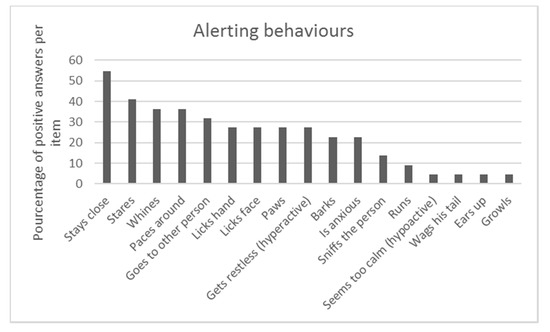 Seizure alerting behaviors were diverse, see Figure 1. Behaviors that were reported the most commonly were staying very close to the person (54.5%), staring (40.9%), whining (36.4%), pacing around (36.4%), going to another person (31.8%) and licking their face or hand (27.3%). Three participants (13.6%) reported, in the category “other behavior”, that their dogs could “gently bite” (bite without pressure) to alert. Pet dogs were described mostly as being but not systematically in the same room (47.6%) or always (38.1%) in the same room. When the alert behavior was displayed, a majority of owners reported that their pet dog was looking at them (60%), although the majority were not in contact with their pet dog the moment before the alert (59.1%). The alert behavior often developed from the first day the pet dog was exposed to a seizure (45.5%), within the first week for 18.2%, one month for 13.6% or after a few months for 22.7%. Almost half of the owners reported that their pet dogs demonstrated seizure-alert behaviors for each seizure (43.8%), but a third reported that this was not the case (37.5%), while 18.7% did not know.