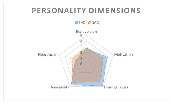 Significant differences were found between spontaneously alerting dogs and non-alerting dogs for the traits Motivation (n = 24, Umean = 98, pmean = 0.012), Training Focus (n = 24, Umean = 100.5, pmean = 0.007) and Neuroticism (n = 24, Umean = 27, pmean = 0.037). The scores for Motivation and Training Focus were significantly higher for SAD (Mdnmean = 4, and Mdnmean = 5, respectively) than for NAD (Mdnmean = 3.2, and Mdnmean = 4.2) whereas scores for Neuroticism were significantly lower for SAD (Mdnmean = 1.75) than for NAD (Mdnmean = 2.5). We found no significant differences for Extraversion (pmean = 0.868) and Amicability (pmean = 0.118). SAD and NAD are represented in Figure 3 on the basis of the five dimensions described in the MCPQ-R.