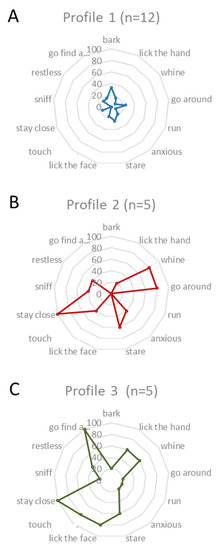 The second profile (n = 5; Figure 5B) included pet dogs that mainly whined and went around the person (80% each). Pet dogs with the second profile did not bark, run, lick face, or go to another person.