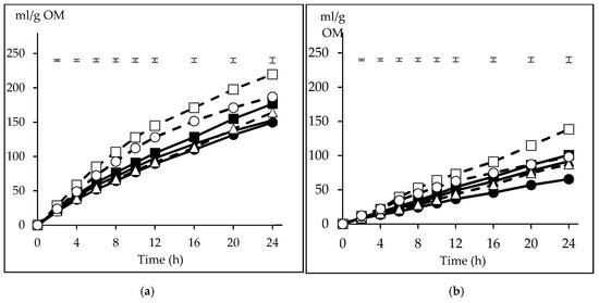 - Nagadi, S.; Herrero, M.; Jessop, N.S. The influence of diet of the donor animal on the initial bacterial concentration of ruminal fluid and in vitro gas production degradability parameters. Anim. Feed Sci. Technol. 2000, 87, 231–239. [Google Scholar] [CrossRef]