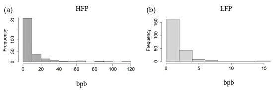 Histogram of feather pecks delivered in bouts per bird (bpb) for (a) the high (HFP, n = 270) and (b) low (LFP, n = 222) feather pecking lines. Note the different scales used for clarity.