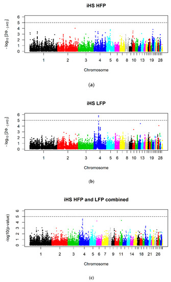 P-values of the integrated haplotype score (iHS) for (a) the high feather pecking line (HFP, nSNP = 22,425), (b) the low feather pecking line (LFP, nSNP = 23,084) and (c) their combination (nSNP = 16,766). The dashed lines indicate the nominal level of significance p ≤ 10−5.