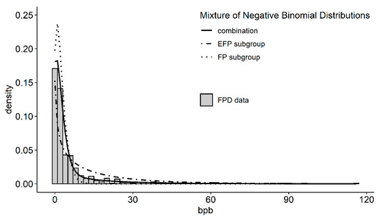 where is the proportion of EFP hens in the population. Here, is the density of in the EFP subgroup, and is the density of in the FP subgroup. It is assumed that has a negative binomial distribution within each subgroup. The distributions have parameters and , respectively, where is the mean of for subgroup j (j = EFP or FP) and is the standard deviation. The parameters were estimated with R package “mixdist” [33].