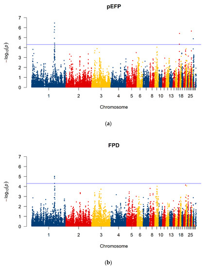 GWAS revealed four nominal significant (p ≤ 5 × 10−5) SNPs on Chromosome 1 for FPD (Figure 6). For pEFP, seven significant SNPs on Chromosome 1 were found including the same four mentioned above for FPD, two on Chromosome 17 and one on Chromosome 26 and 28 (Figure 6), respectively. The full list of nominal significant SNPs can be seen in Table 1.