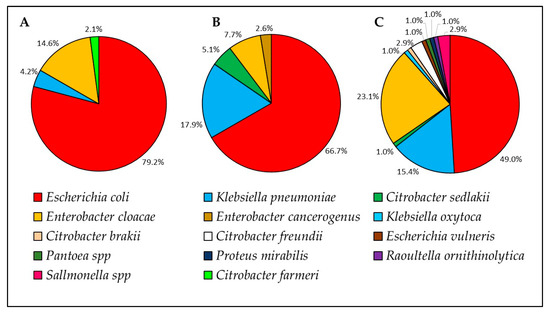 3.4. Distribution of ESBL-E Species and ESBL Genes