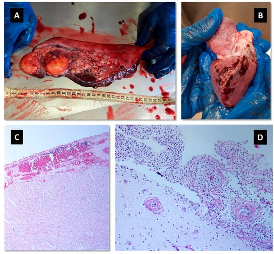 (A) Reproductive system: multifocal pyogranulomatos, irregular lumpy and firm texture, and extensive hemorrhages. (B) Heart: multifocal to coalescing epicardial hemorrhages and mild emphysema of the atrium. (C) Heart: reactive mesothel with hyperthrophy of the mesothelial cells resembling cuboidal epithelium, extensive hemorrhages and inflammation with mononuclear and polymorphonuclear cells. Inflammation is also present in the blood vessels’ wall (vasculitis) with some level of liquefying necrosis (hematoxylin and eosin, 100 magnification). (D) Brain: meningoencephalitis; fibrin and white blood cells in the blood vessels of the meninges. Perivascular cuffing with vascular liquefying necrosis (hematoxylin and eosin, 400 magnification).