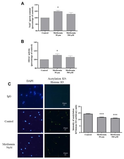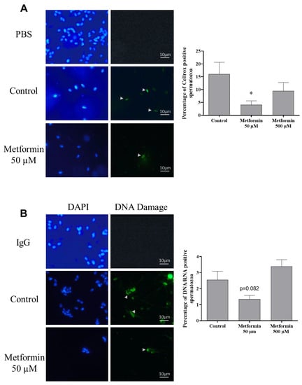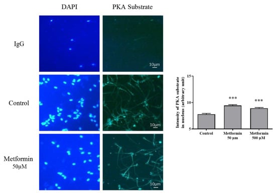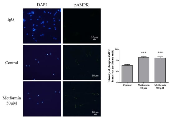 - Hurtado de Llera, A.; Martin-Hidago, D.; Gil, M.; Garcia-Marin, L.; Bragado, M. The AMPK activator metformin inhibits one of the main functions of boar spermatozoa, motility. FEBS J. 2012, 279, 52–576. [Google Scholar]
