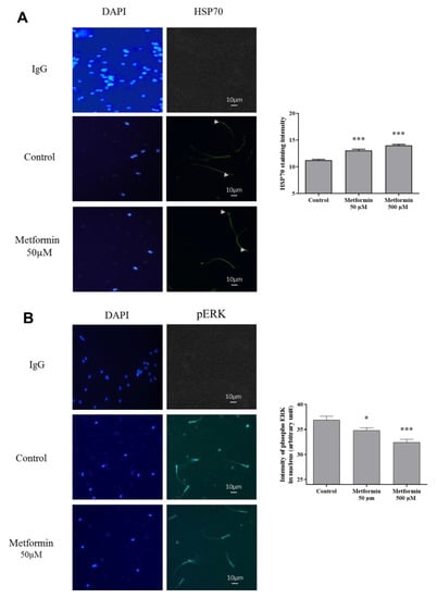 - Bertoldo, M.J.; Guibert, E.; Tartarin, P.; Guillory, V.; Froment, P. Effect of metformin on the fertilizing ability of mouse spermatozoa. Cryobiology 2014, 68, 262–268. [Google Scholar] [CrossRef]