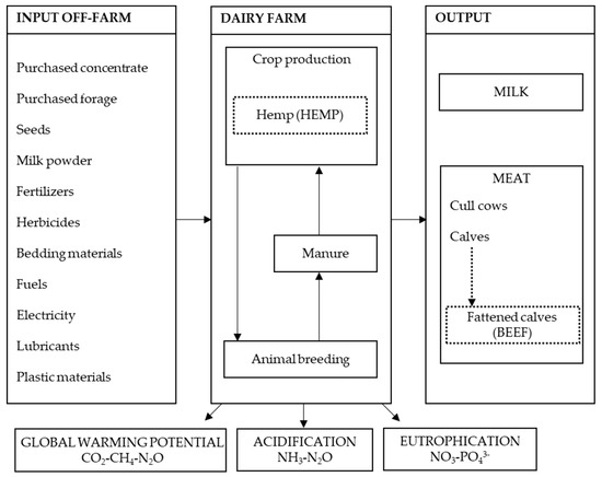 The environmental footprints were assessed through the LCA method [15,26,27,28,29]. In the present study, the goal of the LCA was to assess the environmental footprint of milk production in dairy farms that rear a dual-purpose breed, Italian Simmental, and to assess how the enhancement of the co-product beef and the cultivation of hemp and the use of the hempseed cake in the diet of animals can influence the emissions apportioned to milk yield and to the utilizable agricultural land (UAL).