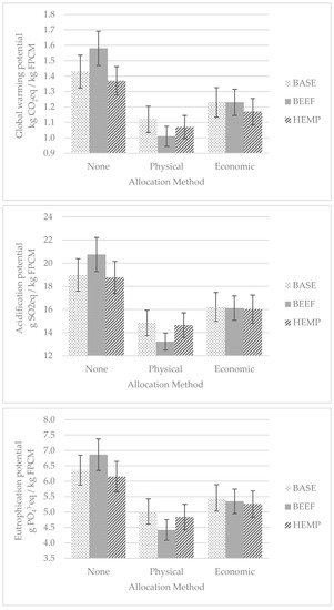 Considering the HEMP scenario in comparison with the BASE Scenario, the GWP, AC and EUP dropped by approximatively 4.2–4.9%, 1.2–1.3% and 3.3–3.7%, respectively (Figure 2), depending on the allocation method adopted. These effects were mainly due to the reduction in the soybean or of the protein concentrates purchased (188 kg/LU on average per farm), and also by the reduction in other off-farms inputs, such as fertilizers and pesticides (85 kg/ha on average per farm ), as hemp is a low-input cultivation, which is explained by Amaducci et al. [45].