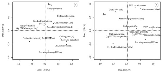 Figure 3a shows the PCA of farm characteristics and GWP expressed as CO2eq/kg FPCM calculated with the no allocation method. The first and the second principal component explained 28.1% and 26.6% of the total variance, respectively. All the impact categories considered—GWP, AC and EUP—were characterized by positive loadings on the first component; conversely, on the same component, milk production per cow and production intensity were characterized by negative loadings. This means that, as previously discussed, the environmental emissions of the farms could be reduced by increasing milk production per cow and production intensity. Interestingly, the emissions, especially in terms of GWP and AC, were closely associated with the culling rate, highlighting the importance of improving the efficiency, not only in milk production performances, but also in the reproductive performances of the animals, for reducing the environmental footprint of the farms. The results change using UAL instead of FPCM as the functional unit (Figure 3b), as also explained by Bava et al. [58]. Indeed, in this case, GWP and AC were positively associated with production intensity. Moreover, the first principal component, which explained 34.3% of the total variance, highlighted a negative relationship between the impact categories GWP and AC and the feed self-sufficiency of the farms, while the second principal component, which explained 23.4% of the total variance, highlighted a negative relationship between EUP and feed self-sufficiency and a highly positive relationship between EUP and the percentage of the concentrates in the diets of animals.