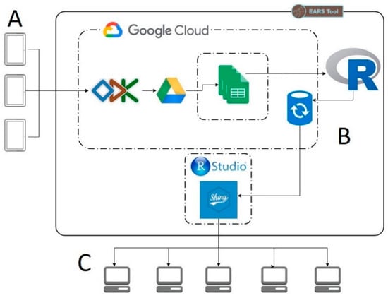 EARS data workflow with (A) representing data collection on an android device, (B) representing the cloud-based data storage and manipulation and (C) being the end-user interacting with a dashboard.
