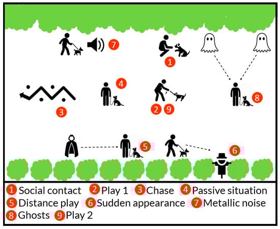 Overview of the outdoor testing area and the position of each subtest; (1) Social contact, (2) Play 1, (3) Chase, (4) Passive situation, (5) Distance play, (6) Sudden appearance, (7) Metallic noise, (8) Ghosts, (9) Play 2.