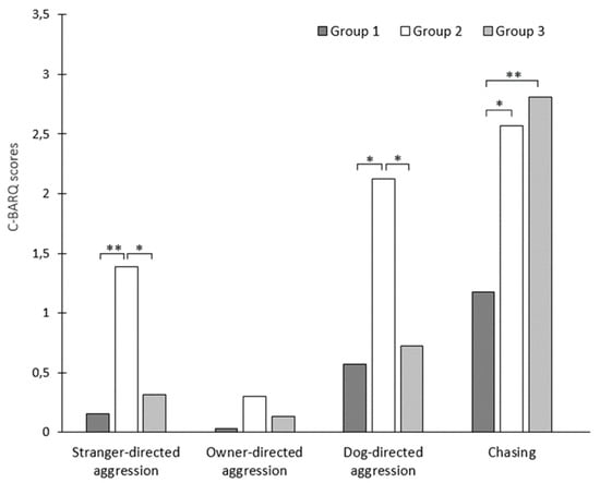 Owner-reported dog behavior using the C-BARQ questionnaire scoring by aggression groups (* p < 0.05; ** p < 0.001). Group 1 = non-aggressive dogs; Group 2 = dogs, aggressive towards humans; Group 3 = dogs, aggressive towards animals.