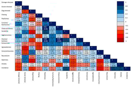 Correlation matrix of the coefficients of the variables in the group of dogs which were aggressive towards dogs and other animals, with significance levels in brackets.