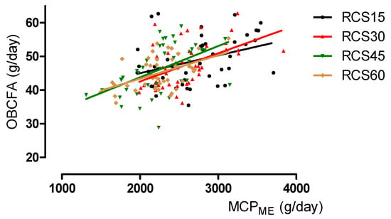 Relationship between the yield of odd- and branched-chain fatty acid (OBCFA) and microbial crude protein (MCP) synthesis, estimated based on intakes of metabolizable energy (MCPME), R2 = 0.27, p < 0.001. The total mixed rations (TMR) comprised forage and concentrates (0.75:0.25), with targeted ratios of red clover silage (RCS) in the TMR of 0.15 (RCS15), 0.30 (RCS30), 0.45 (RCS45), and 0.60 (RCS60) on a dry matter (DM) basis.