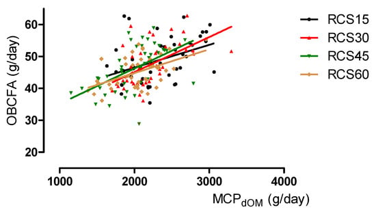 Relationship between the yield of odd- and branched-chain fatty acid (OBCFA) and microbial crude protein (MCP) synthesis, estimated based on intakes of digestible organic matter (MCPdOM), R2 = 0.29, p < 0.001. The total mixed rations (TMR) comprised forage and concentrates (0.75:0.25), with targeted ratios of red clover silage (RCS) in the TMR of 0.15 (RCS15), 0.30 (RCS30), 0.45 (RCS45), and 0.60 (RCS60) on a dry matter (DM) basis.